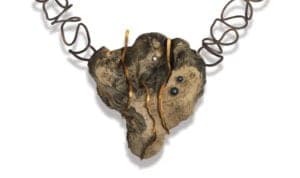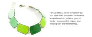 April Hale of April Hale Jewelry in Bozeman, Montana, also embraces the concept of incorporating unconventional, but sustainable, materials. Her early work featured roadkill parts. Hale would skin the animals and use their teeth and fur in jewelry. Now, she strives to make her jewelry with 80 to 99 percent reclaimed or recycled material, often incorporating many unlikely elements in her work. For instance, an old wheelbarrow or a pipe from a wooden stove serve as steel sources. Nothing goes to waste—even roofing copper and fencing wire are transformed.