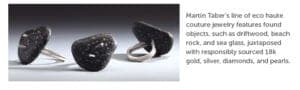 His line of eco haute couture jewelry features found objects, such as driftwood, beach rock, and sea glass, juxtaposed with responsibly sourced 18k gold, silver, diamonds, and pearls. His goal is to invite the consumer to reconsider the term "precious" and to understand that the natural environment is not just a source, but something that can be shaped and used. His mix of high and low elements celebrate the natural world "in its own right, regardless of what humans have decided to call precious." Taber redefines the word to include wildness—he doesn't cut the natural materials, doesn't set bezels around them. The wood is not oiled—it's tumbled in the surf and sun, enhanced by the organic processes alone.