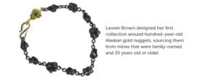 True to her word, she designed her first collection around hundred-year-old Alaskan gold nuggets, sourcing them from mines that were family-owned and 20 years old or older. As she seeks to include other materials from sources that comply with the stringent U.S. Environmental Protection Agency standards, she's unwilling to settle for anything less than complete transparency so she can verify the origin. "Thus, my material options are quite limited," she admits.