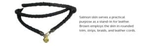 In addition to the raw Alaskan gold nuggets she uses as embellishments and centerpieces in her work, she includes other unorthodox materials, such as salmon skin, in her collections. Brown began using the skin in her designs after receiving a shipment from a native organization faced with an extra supply following the closure of tanneries. Besides contributing to the Alaskan story she likes her work to tell, it serves a practical purpose as a stand-in for leather. Brown employs the skin in rounded trim, strips, braids, and leather cords.