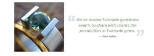 She believes that showing customers what change is possible via the choices they make influences them to be more responsible. As motivation, she likes to connect the customer to the source by sharing images of a mining community in Peru. "We've done events for client education featuring our Fairmined metals collections, where we shared the story of the Aurelsa [mine] personally and via a slideshow. We've hosted Fairtrade gemstone events to share with clients the possibilities in Fairtrade gems. We talk about it, and talk about it, and then talk about it some more."