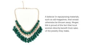 Similarly, Megan Kitt, founder of Tuli, a company selling jewelry made in Uganda using recycled paper beads, thinks that jewelers can appeal to customers in a way other companies cannot by revealing how their products are made. "Sharing the story behind a product makes monumental strides in consumer education." Kitt feels that transparency can influence the buyers, "I've found that being honest with our customers through our struggles and triumphs creates a level of trust between us that causes them to listen to what we're saying rather than discount it as another marketing effort." A believer in repurposing materials, such as old magazines, that would otherwise be thrown away, Kitt is proud of the fact that local women directly benefit from sales of the jewelry they make. "We practice responsible business that not only provides a beautiful, meaningful product to our customers, but also changes the world for the better," she says.