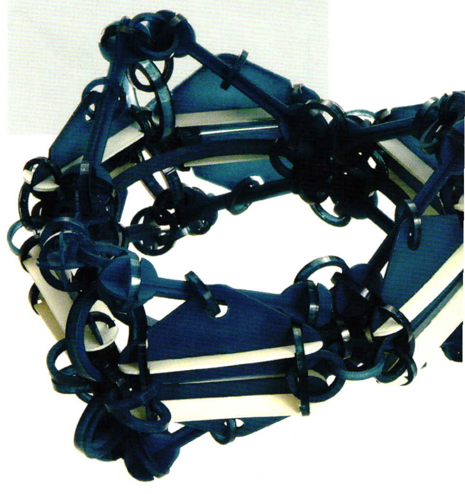 However, all of this success is no reason for the Berlin-based jewelry designer to rest on her laurels, but instead to seek the entirely surprising idea. Svenja John has honed her technique, and has succeeded for years in producing new jewelry objects with the same material and a variable insertion system. She is always interested in new languages of forms. which demand of observers the ability to see them constantly in unusual lights. "I am always looking into the future as a jewelry designer because constantly repeating what is known (and popular) is not enough for me," says the Berlin-based artist. In this way, for example, the last few years have seen the creation of jewelry items such as Oxo or Altai made of particularly thin foil, whose special surface processing and matching coloring make them appear as if they were made of natural materials such as wood or coral. The confusing play between manual work and technology appears to be a particular pleasure for Svenja John. The geometric forms of her jewelry elements falsely indicate machine precision, although they represent to 100 % handiwork. Svenja John proceeds even more technoid and geometrically in her latest work, such as for example the necklace X001 dated 2004 or the bag Xoa, which was recently acclaimed with the red dot award. All elements - significantly more homogeneous in terms of basic forms than in the older models - are cut by water jet and put together to form three-dimensional structures. The optical attraction emerges from the colorfulness and the constant repetition, fascinating in its complexity. These extraordinary objects have their place somewhere between art and design, and they barely have anything in common with classic jewelry art. This prompted a Japanese journalist to comment: "Svenja John's beautiful contemporary jewelry made me realize that a precious stone can be far less sparkling than a good idea."