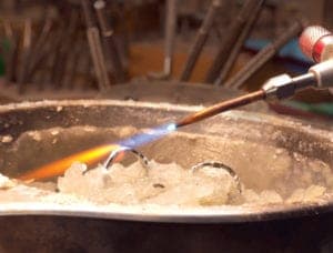 Like many jewelers, Marc Firestone of Krombholz Jewelers in Cincinnati relies on a heat-shielding paste to guard against any heat exposure during soldering. "I have a 6 inch stainless steel pot, and I'll fill it about three-quarters of the way with Thermo Shield [his specific brand of paste] and then sink things in it that I don't want to get hot," he explains. "You can also make little troughs where you're working, to help concentrate the heat. When I had a big chain that I was trying to solder a tongue to, I put the chain and tongue into the paste and then made a trough in the paste where I put the solder."