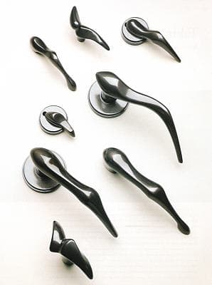 While innovation in ornamental hardware may have been more limited during the Modern period, the creativity encountered today is the result of something more than the predictable cycles of style and aesthetics. Designer Jennifer Coppel comments, "Because of its function, hardware is a tool, a tool that becomes an extension of our hand. Extending ourselves in both the physical and intellectual sense is what excites and challenges most hardware makers today." Coppel may seem to he stating the obvious, yet in the last two decades, our growing preoccupation with the intangible seems to have whet an appetite for the tangible. In the Information Age, when human communication at large has become a more elusive and ephemeral enterprise, looking for that extension of the hand, that sense of physical connection, may be a natural and intuitive human impulse. And certainly metalworkers are skilled in forging such connections.