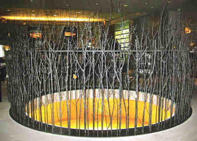 Kiss explored similar naturalistic imagery on a much larger scale for Takashimaya, the Japanese department store's flagship space on Fifth Avenue . The sixth floor atrium opening onto the fourth and fifth floors has been encircled with a delicate hedge of interwoven sapling branches, a four - and - half foot - high thicket of sumac, cherry, and birch, cast in bronze. Interspersed among the branches are a sequence of 18k gold butterflies that appear to have alighted from some transcendent migration. While working as a barrier from the floors below, the piece appears as a crown of sorts, jewelry for architecture indeed.