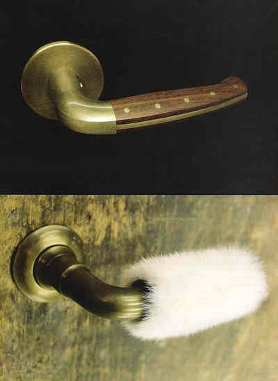Butler also works with contemporary American architects and designers for custom work. Among the customized hardware the company has produced are such curiosities as a brass and wood lever handle reinvented by Merry Despont from an antique French dagger for Bill Gates and a lever handle sheathed in ermine designed by Benjamin Noriega - Ortiz for rocker Lenny Kravitz. When asked whether such custom work has wider applications, Butler reports, "Very little custom work is appropriate for larger production. Most of it is pretty project oriented."