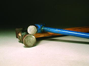 He reaches up over the bench and pulls down another hammer, one that looks like it was found at an archaeological dig. He shows me its face; a floral design is delicately carved into it. "That's another thing you can do," he says. "Take yourself a separatin' disc - a good one, one o'them silicone carbide doohickeys - or a diamond bur, and cut yourself a design. One good wallop and you got a nice stamping of a flower. Lewton-Brain showed me that, too."
