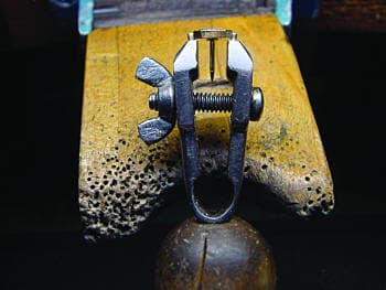 He picks up the tool and holds it up in front of my face. "Look close, now. You see how I carved notches in those nails, about halfway through? That's what does the holdin'. And I sanded 'em down nice and smooth with a sanding disc and a #180 pumice wheel so they wouldn't leave marks on the jewelry piece when I tighten it up. Now I just put a pendant or whatever between the nails, turn the screw here on the vise, and it gets held in there good. Don't need shellac or nothin' like that to keep it in place. Pretty nice, ain't it?"