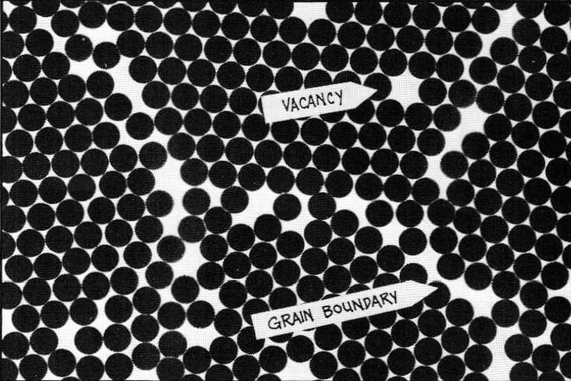 Illustration 2 shows a stylized close-up view of this area. Notice that the pattern is interrupted. As the crystals grow they impinge on one another causing grain boundaries made up of dislocations. Together with vacancies, these are part of what allow a metal to be deformed. When stress is applied (e.g., when you draw a wire) the crystals slide over each other in a behavior that is characteristic of metals.