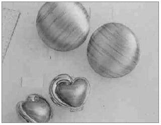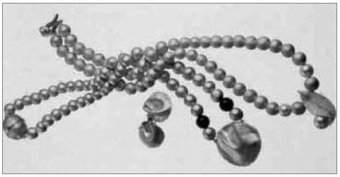 The new gold and other precious metal clays developed by Mitsubishi Materials Corporation [9] are an exciting development. This material, comprising metal powders in a binder, is literally like potters clay and can be moulded by the same techniques. It can also be moulded in novel ways, and is potentially suitable for mass production of jewellery components and pieces using cheap, easily made tooling. It produces a novel surface finish, although this can be polished to a conventional bright reflective surface. Something of the material's potential in opening up new design opportunities that cannot be achieved by conventional goldsmithing can be seen in the slides, Figures 9 and 10. The beads are hollow and one can texture the surfaces individually by hand using simple tools.