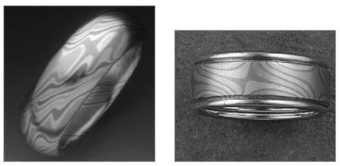 | Figure 3 and Figure 4 Mokume Gane rings in 18 karatyellow/14 karat red and palladium white golds and silver by James Binnion |