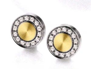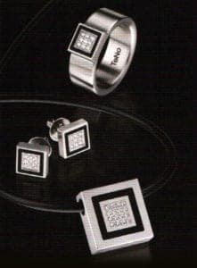 Symmetry evoked by geometric shapes is the typical trademark of TeNo and continues to feature throughout the entire TeNo de luxx jewelry range. Pavée style diamond settings cause the precious stones to sparkle in a completely different way. Shimmering diamonds gather around the ceramic matt black surface on satin-finished stainless steel as if drawn by a magnet. The contrast of the black squares against the light-reflecting diamonds gives the TeNo de luxx pieces a unique power of expression which makes them a real object of desire.