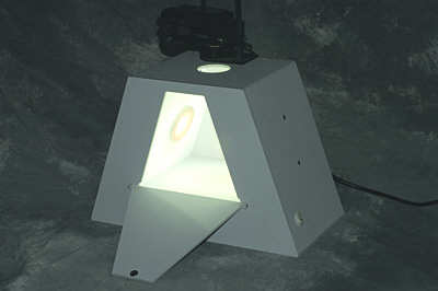 The engineering of the Gem eBox provides a sturdy way to address all of the potential problems inherent to photographing jewelry. The interior is designed as a visually sterile environment, eliminating most, if not all, potentially annoying reflections. It is designed as a truncated triangle, with daylight balanced fluorescent lights handily diffused behind white Plexiglas in the floor and the two slanting upper walls of the stage. This setup provides shadow-free lighting of the most detailed object without creating hot spots. However, the kicker in the Gem eBox design is the two halogen lights recessed into the upper part of each slanted wall. These halogen lights add back into the Gem eBox environment just enough warmer, non-diffuse light to bring reflective gems back into a very realistic balance.
