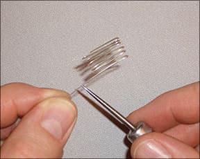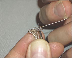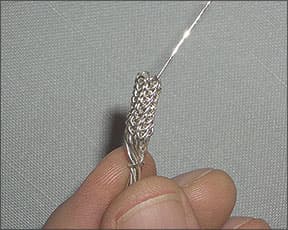 I'll begin by taking a crochet needle or spindle and use it as the support to create the first of the foundation loops. These loops are just that-they form the base of the knitting process-and the number of loops determines the diameter of the chain. I typically use six loops (see Figure 1); with 0.4 mm wire, that will translate to a 4.5 mm diameter chain.