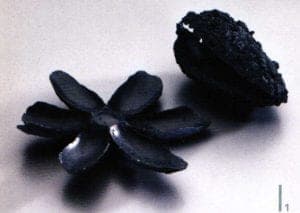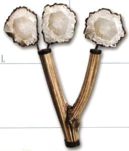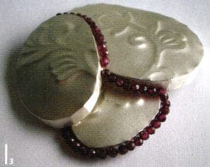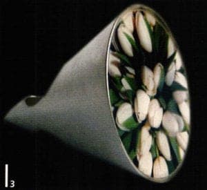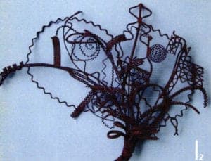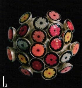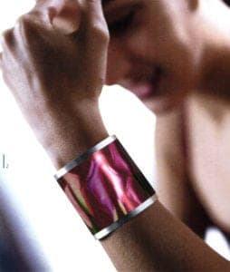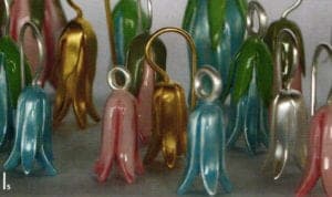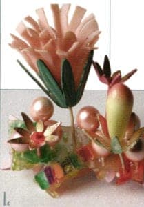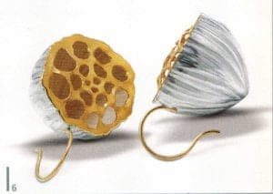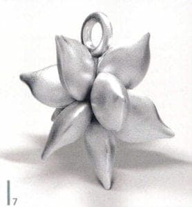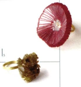 A series of works with their floral forms moves on the thematic interface between naturalness and artificiality. Helen Britton designs heavenly gardens in dislocating coloration and Terhi Tolvanen observes nature precisely to translate foreign universes of forms of cactuses and other succulent species into jewelry. She uses very natural materials such as silk, wood and minerals Ulrike Hamm elicits paper-thin sheet layers from the resistant natural product of parchment to tame them into airy lightweight bundles like a freshly picked bouquet. It's especially artificial materials such as plastic and artificial resins that are suited to plastic work Sally Marsland models jewelry as portable art from a blend of car-filler and graphite pigments. With her different approaches, she's also involved in a dialog with nature fluctuating between vague intimations and specifically developing typical features of the form of a blossom. Doris Betz experimented with hosta glass, a transparent plastic, when she was studying in Vienna as an artist in residence. Creations resembling vegetables, some with bizarre shapes, emerge almost as if by accident. She took this material and declared "the transparent and translucent that is suspected to underlie t and can just be seen" to be the theme of her jewelry.