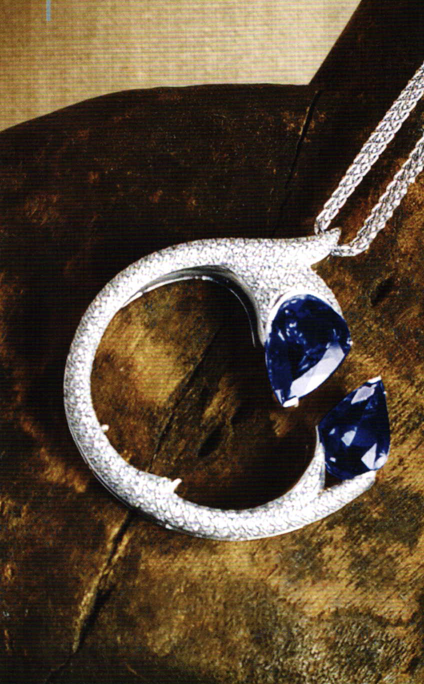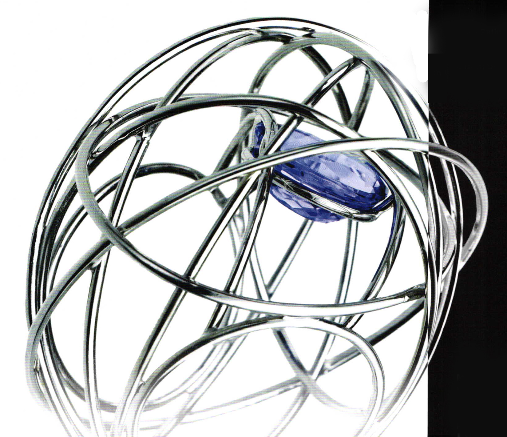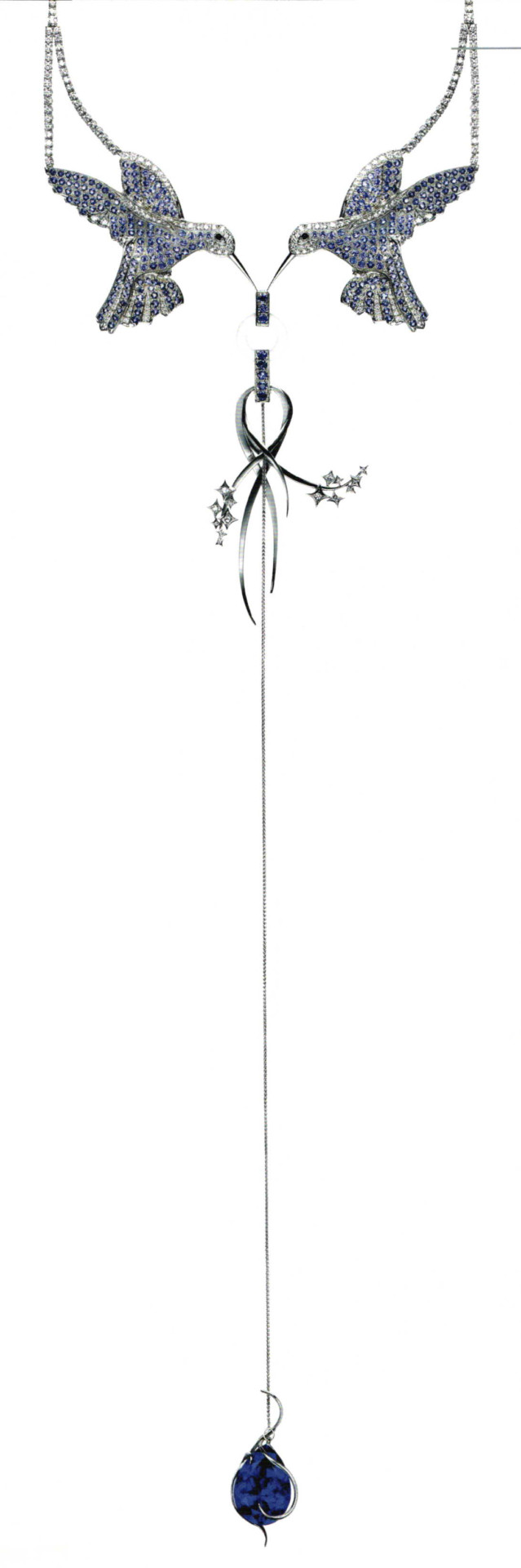 Marking the competition, the rising star James Powell created an extremely delicated item of jewelry; two humming birds of ethereal appearance watch over their precious cargo - one drop of tanzanite symbolizes a newly born child. Diamonds, iolite, onyx cabochons, rock crystal and white gold