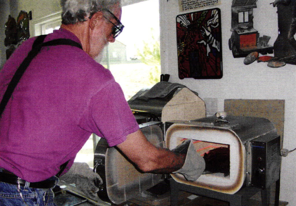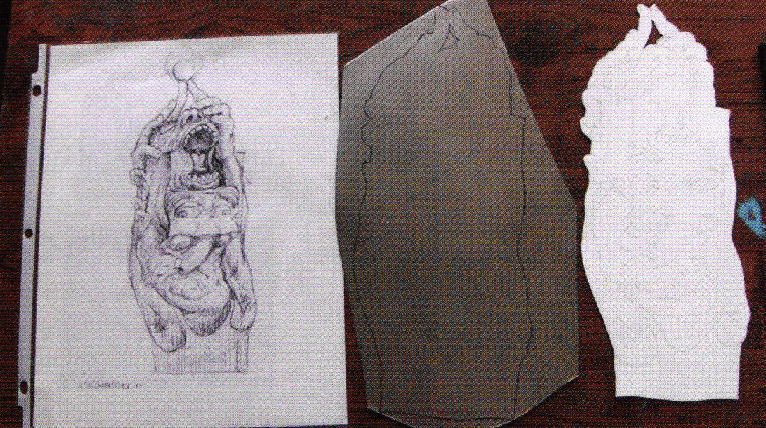 - The initial step was to protect the drawing to size on paper by using an opaque projector. Next, I cut out the image to check its fit and clearance inside my kiln. Upon verifying the fit, I traced the outline on clean 24 gauge cold-rolled steel with permanent marker.