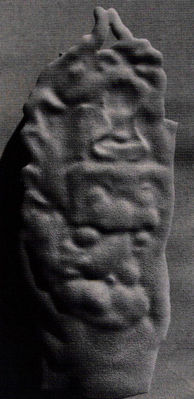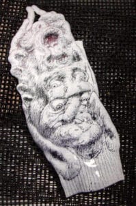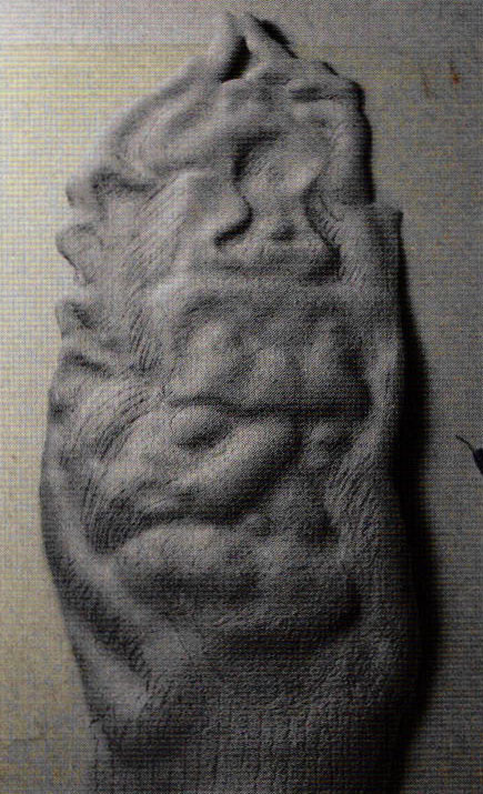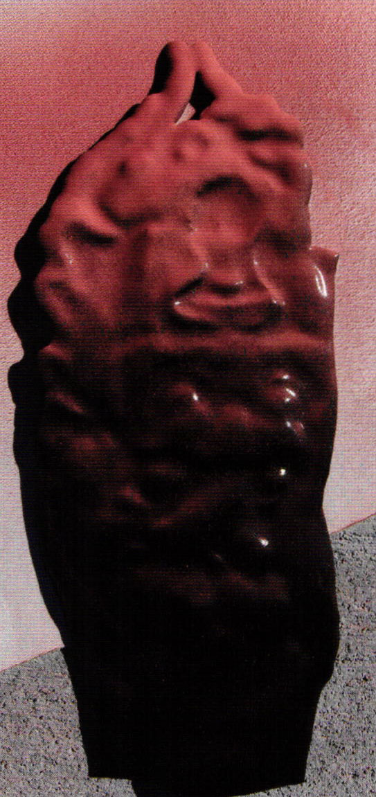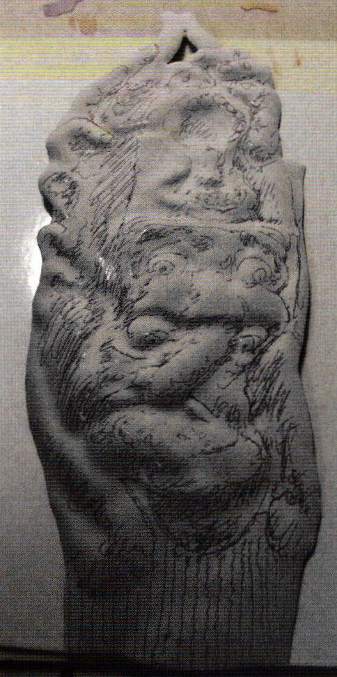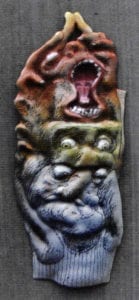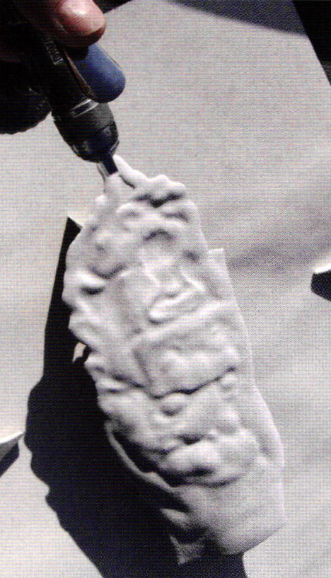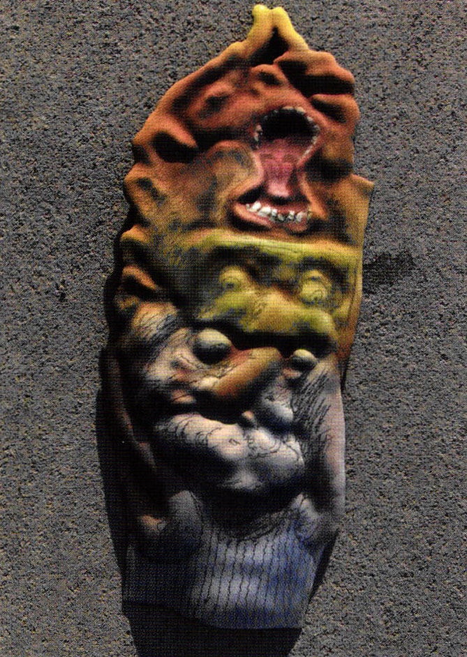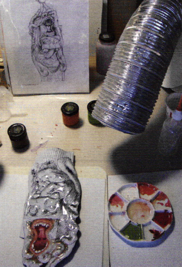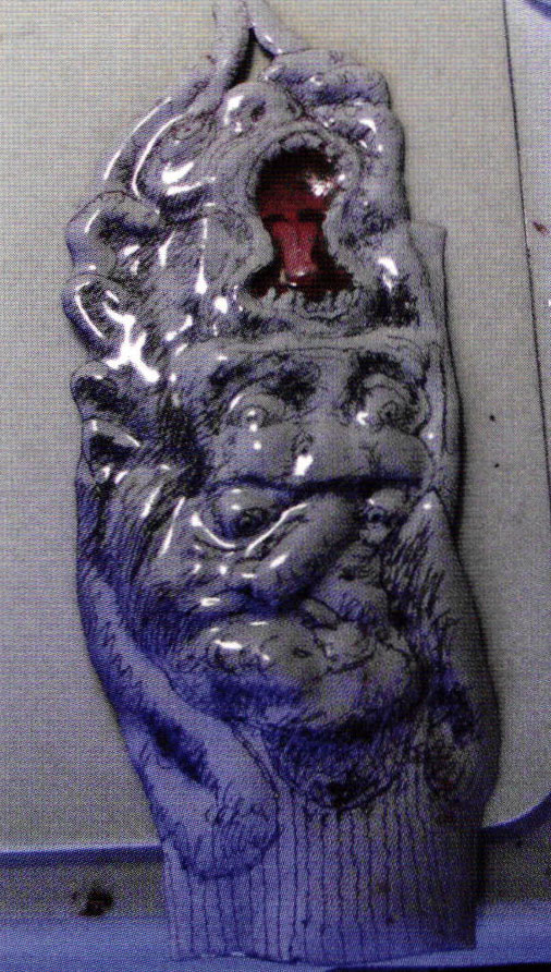 - After painting the mouth and tongue with reds and pink tones, orange was applied to the lips and dark areas around the eyes and fingers before airbrushing lighter tones; a multi-pointed sgraffito tool softened hard edges.