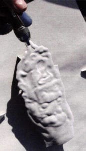 - A smaller spray-gun was used to achieve a granular spray coat of white porcelain enamel. I used approximately 20-25 lbs. of air pressure with an adjustable air compressor. A low pressure is required to achieve the build up of enamel grains while avoiding blowing them loose. The spray-gun should be over a foot away from the enamel art. It was necessary to begin spraying, using a light spray from a low angle toward the top of the art piece to establish the texture to be built up with additional spray layers; this angle also suggested a light source, as the indented areas received less build-up, suggesting shadows. I built-up thickness by slightly drying each layer between sprays, stopping short of too much build-up indicated by grains breaking off.