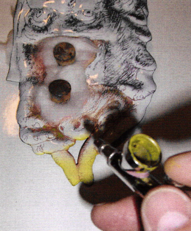- After drying the painted mouth with a hair dryer, I placed a wad of cotton over it and weighted the masking to keep it from moving during airbrushing. Again, using oil based enamel which was formulated to be used for silk screening, I mixed the enamel in a porcelain palette dish to isolate each color. Rubbing alcohol thinned the oil enamel to a watery consistency, enabling it to flow through the airbrush. I use a gravity cup airbrush which is less apt to plug with enamel; between sprays I added water to the cup to prevent dry-out. I began with yellow airbrushed enamel using 20 lbs. air pressure.
