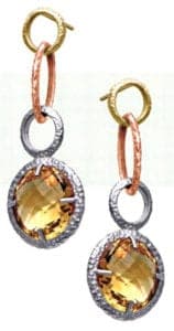 18 karat hammered yellow, white and rose gold earrings with citrine