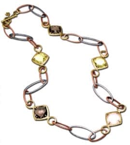 18 karat hammered yellow, white and rose gold necklace with smokey, rose and lemon quartz