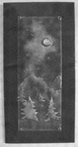 The last art work featured in this article is of an untitled moonlit pine forest. There are several levels of metals in the work, starting with large black enameled rectangular base on 20 gauge copper. Two holes are drilled through this black piece in order to loop a wire through for hanging. The knot is concealed when the landscape layer is finally attached to the base layer. The next layer is again copper, with holes cut in it to form stars. The stars are fine silver foil bits just under each hole that are laid upon the counter enamel and fired for permanency. The moonstone cut with a face jewel has a fine silver bezel that was empty and hard silver soldered to the sky before being enameled, with the stone inserted later. The small mountain is of 26 gauge. Juanita usually uses this lighter gauge to control weight for wall works. She finds it durable when counter enameled, which she consistently does on all enamel parts of every art piece.
