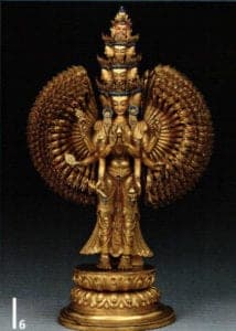 The thousand-armed Avalokitesvara, Tibet, late 17th-18th century. Copper, fire-gilded, turquoise inlay, painted with cold gold and colors