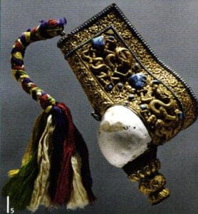 Conch trumpet, Tibet, 18th century. Conch shell casing, silver with fire-gilding, turquoise inlay, silk ribbons
