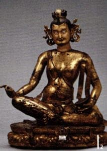 Indian Mahasiddha Kanha, Central Tibet, 1st half of 16th century. Chased sheet copper, fire-gilded, partly decorated with color paint and cold gold, gemstones, coral
