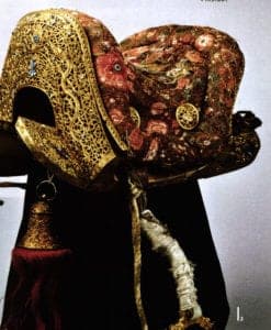 Saddle of a Dalai Lama, Tibet, 18th/19th century. Copper, fire-gilded, gemstone inlays, wood, leather, brocade, felt