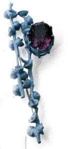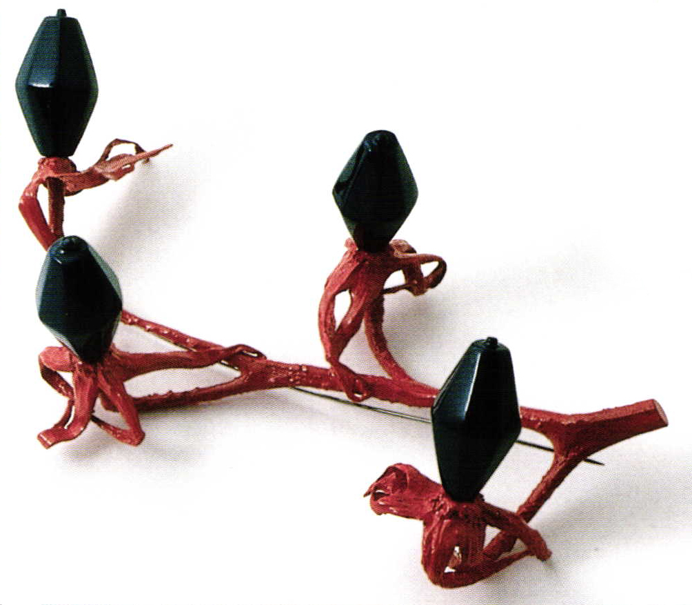 "I like picking flowers up off the floor" Georg Dobler has rediscovered this traditional subject for himself. However, his blossoms do not speak any additional, symbolic language. They are very unpretentious and possessed of a simple sensuality in form as star anise, grape vines or cape gooseberries. In the selected arrangement and the balanced ratios between the blossom heads and the twigs, Dobler works with substantially classical design principles. The cast forms of real twigs mean that the brooches appear hyper-realistic in terms of their form. However, their colors appear extraordinarily synthetic. He does not attempt to replicate nature and most certainly does not idealize it. Georg Dobler creates pieces of constructed naturalness.
