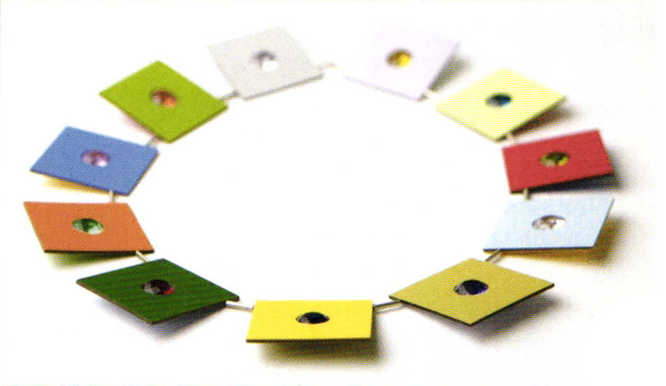 Necklace, "Colorchain", by Herman Hermsen, 2002. Formica, synthetic stones, silver, steel cable