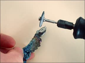 I selected a piece of Rainbow Crystalline Titanium that had a matte gray area on the bottom that I wanted to polish. When polishing select areas, or removing sharp edges, use a dremel equipped with a rubber wheel made for use with Titanium. Start with a course wheel, and progress to a medium and then a fine wheel. Remember to keep the wheel moving to prevent grooves from forming. The resulting reflective mirror finish is a lovely contrast to the rainbow crystalline areas.
