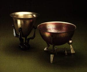 The "floating" or "multi-leg" bowl series, (Figures 3 and 4) consists of three bowl types, or shapes, and a variety of sandcast brass legs. The basic premise was to lift the bowl up off the ground plane and relieve it of the necessity to stand alone by either having a flat bottom or an added foot. The Asian esthetic of displaying objects is evident here. Metalsmiths rarely are able to complete a holloware form without altering it for stability. Here, Markusen finally finds one elegant solution that lifts up the bowl to be admired for all its fullness and sensuousness. The copper bowls themselves were spun outside the studio by master spinner Bernie Towel, who has worked with Markusen for many years.