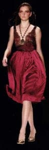 Joanna Mastroianni's black-and-white checkered coat with faux fur cuffs and collar is cinched by a wide black belt. But that isn't enough; the black leather is studded with large silver and blue sand dollars. Anna Sui ties together a midnight blue Cossack-style dress with a wide, gem-studded leather belt. She creates a military look by adding a wide, gold chain belt, complete with gold buckle and tassel, to a short black skirt and coat.