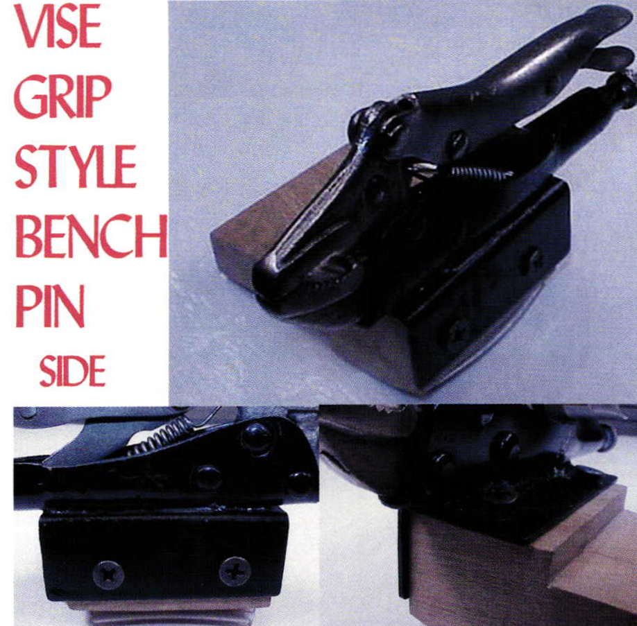 Take a bench pin and cut it down to about I inch long from where it enters the pin holder. Take the spring out of a small pair of Vise Grips to preserve the temper in it. Cut a piece of light angle iron to match width of bench pin. Drill four holes for screws. Braze the Vise Grip onto the angle iron. You can attach the Vice Grips horizontally as pictured above right or sideways as pictured above left. I recommend making two sets, one each direction as the both are useful in different situations. Sandblast and paint to prevent rust. Reattach the spring in the pliers and mount to the bench pin (Suggest pre-drill holes). I prefer to use a GRS bench pin holder as they use side and bottom tightening screws to keep pins really tight. I suggest you solder large wing nuts on these tightening screws to save your fingers. This holder works great for holding small items to be cut, trimmed, and filled.