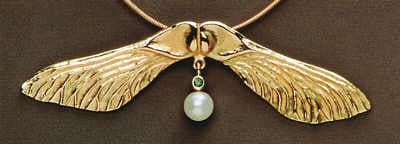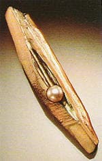 In China , Japan , and Korea , the elemental image of the dragon (a reservoir of the ch'i of nature, water, wind, thunder, and rain) often contains a pearl or jewel in its mouth, or held by its chimerical legs. A symbol of wisdom, one must enter the dragon to achieve insight, thereby working with its elemental force. This myth is antithetical to the medieval tales of St. George, who slays the dragon to carry away the princess, Marguerite, whose name in French means "pearl." Pearls appear combined with gold in several works, including the Mia Divining Rods brooch by Susan Chin, of mixed metals and semiprecious stone, and the Pendant by Hiroku Pijanowski The divining rod, an intuitive tool to uncover the secret movement of water in both East and West, expresses a feeling of hope and discovery in the balanced design by Susan Chin. Pijanowski's Pendant marries baroque, exquisitely wrought wings (a symbol of the transitory nature of life) with the eternal luminosity of the pearl.