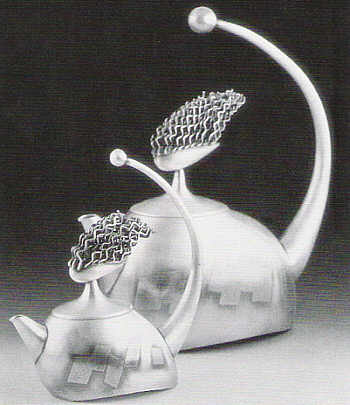 In the realm of function, the amusing tea and coffee pots created by Komelia Hongia Okim play dramatically with the art of feng-shui, which anticipates the movement of chi-energy within the environment. Of Korean origin, Okim states that her work "reflects the principles offing-shun, an Asian philosophy. focused on the relationship between humans and their environment: a philosophical system of hove to live and excel in harmony and nature." Her Harmony #3 Coffee Set is made with the traditional Korean metal technique of kumboo, which overlays 24-karat gold foil on sliver without solder or flux. It invites the user to grasp it from the finial-tipped, open-ended handles that lead to the slanted plump forms of the coffee pots. These forms move forward aerodynamically in space, suggesting birds and other natural forms-. The witty lids of the pots make visible the vaporized steam as it escapes invitingly from the coffee pot, encouraging a sense of warmth, energy, and playful delight in the viewer.
