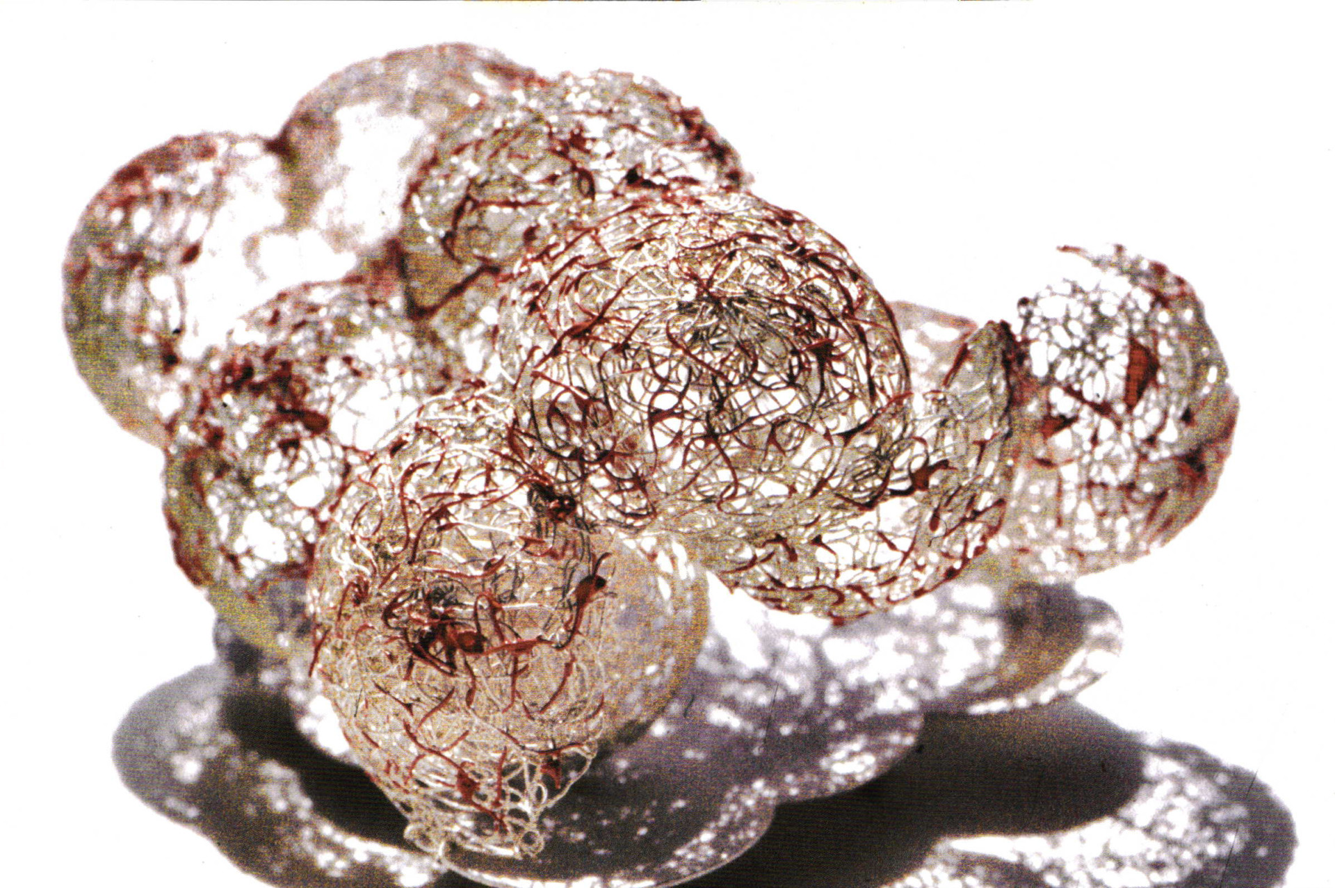 Concentration on the effects of the metal is the predominant feature of most filigree work. A lively interchange between light and shadow is released in the intermediate spaces between the patterns and the structures. Petra Müller-Tichy breaks with the colorful purism. Her works are reminiscent of filigree enamel, intended to incorporate this material. Anna Heindl loosens her sometimes constricted and other times loosely woven structures with colored stones, while Christiane Förster works with numerous layers in the form of a relief. Zirconium can most certainly be burned into a plastic stone. In some cases, stones or other colored materials are densely woven into the substructure and only vaguely glimmer from below.