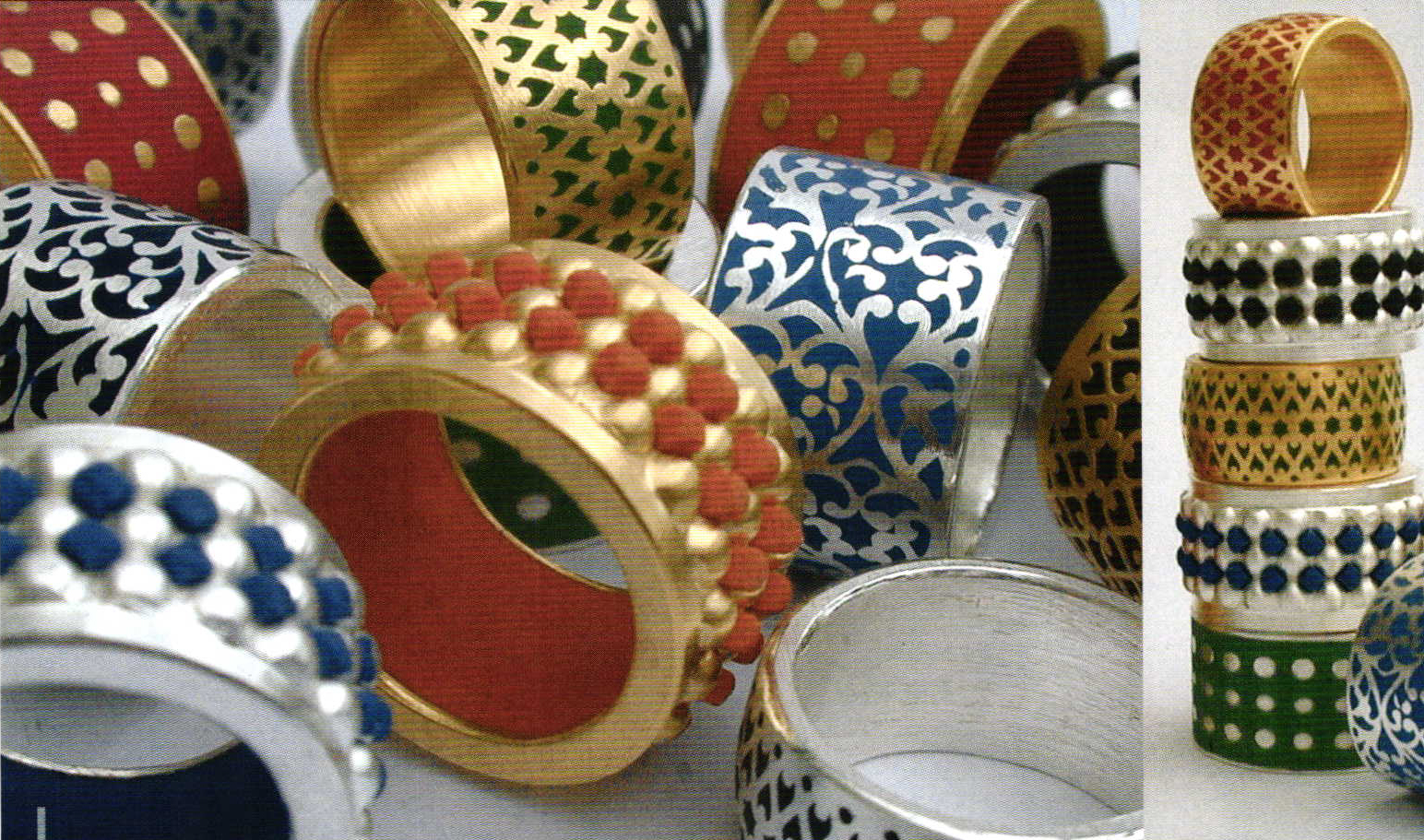 Petra Müller-Tichy, fantasy rings, plated silver and fine gold, silicon or dental ceramics