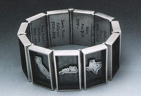 In a departure from the traditional dangles, Chris Irick's charms are printed on sterling rectangles and hinged to each other. "I don't like noisy jewelry," she comments, in likely sympathy with the famous symphony conductor who once asked ladies to check their charm bracelets along with their coats. [7] Irick's Moving Bracelet refers to popular pieces in which enameled silhouettes of states of the Union , usually locations the weaver had visited, are linked to a chain. Each of Irick's states has a dot denoting a city she once called home and an engraved text on the back giving the dates of her residence. When asked about this minimalist timeline, Irick says, "When I think of moving I become emotionally detached because we did this so much, sometimes once a year Still, all those moves shaped the person I am now." One day someone, following a time-honored ritual of children with their mother's charms, will sit with the artist and ask her about each move ("and then?" "and then?") and Irick will fill in the blacks.