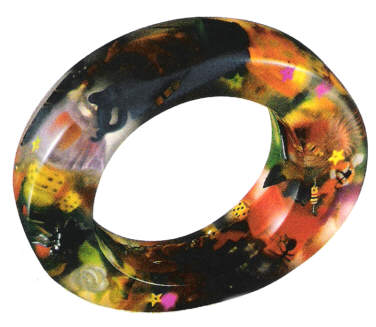 Enough of the past, enough of sentiment and magic. Karen Misher's piece Momentary seems to proclaim the mantra of guru Ram Dass (Richard Alpert), "Be here now!" The optical tenses she has used in previous work have been made into her first bracelet, which reflects the ever-changing world around the wearer. This is "memento as moment," Misher says. "I'm not given to symbolism. What I like best is knowing the reflection will change every second, capturing the moment you're in." This is a bracelet whose meaning is never degraded by time. Years from now, a new owner will never wonder what, exactly, each charm meant to the original holder.