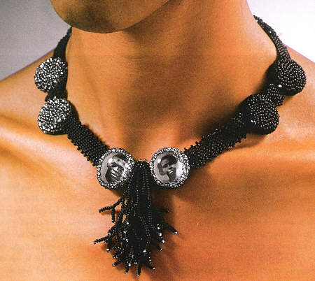 Perhaps Sonya Clark's ancestors would better suit? She did, after all, think of her Trinidad grandparents when she read the phrase "charmed lives." She wasn't glossing over their travails, but acknowledging their influence: "by their lives my life is charmed." Thinking of lockets, she placed their faces around her neck. One set of portraits faces the public and two other identical sets face her heart in "endearing, secretive, protectiveness." The beading in Remembered Lives is a metaphor for lineage: "string one to the next, to the next, to the next", Clark comments. The branching pendant refers to genealogical roots. The white and silver color of the beads boners age in the Yoruba tradition; the black beads refer to the unknown. Clark is a praise singer for her grandparents, and wears their amulet, as praise singers do, to remember their deeds.