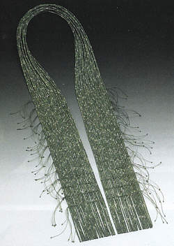 In another neckpiece, Kathy Buszkiewicz uses sympathetic magic to ensure her artistic prowess, as hunters wear claws to enhance their chances of a kill. Her shawl, like all of her recent work, is made of used and shredded paper money, which she buys by the bale from the Treasury Department and transforms into jewelry. For Buszkiewicz the neckpiece is not, as one might reasonably think, a summons to the gods of wealth. Instead, she attributes her recent success as an artist to the inspiration of her symbolically rich medium, and hopes that this mantle of bills will ensure her continued creative powers. Buszkiewicz also acknowledges the resemblance of her scarf to a priest's stole: "Because I teach, I sometimes feel like I'm clergy. I could put on this scarf to listen to student confessions." in this reading, "sympathetic" rather than "magic" is the operative word.