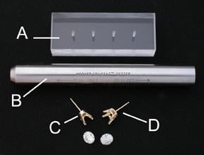 Hoover and Strong provides a range of die struck and cast solitaire earrings with pre-notched bearings in 14 karat yellow and white gold alloys for a full range of gemstone sizes in rounds and fancy cut shapes (C & D). For ease in setting the Tru-Seat mountings, they have developed a system for setting and provide tools necessary to complete the process. The tools include; (A) Plexiglas setting block and (B) the Hoover Tru-Seat setter's punch.