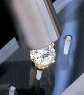 To begin the Tru-Seat setting procedure for solitaire earrings, measure the gemstone and select the proper size settings. Pre-polish the earring settings. Place the gemstone to be set table-down on the Plexiglas setting block. To avoid abrasion to the gemstone, make sure there are no filings or other debris between the gemstone and the block. Place the earring finding directly over the gemstone and firmly press until the gemstone has clicked into its bearing. View from all sides and check the gemstone is level and uniformly seated.
