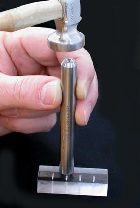 Place the post of the earring in the hole of the Plexiglas setting block. The base of the earring setting rests on the surface of the block. Then place the larger end of the Hoover Tru-Seat setter's punch squarely over the four prongs. Align the punch so it is perpendicular over the setting and gemstone.