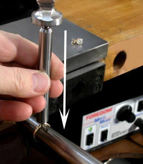 Lightly tap the punch with a chasing hammer to bend the prongs. It should take about 3 or 4 taps of the hammer. If hammered too lightly, the prongs will not be flush on the crown and if hammered too hard, the setting could collapse.